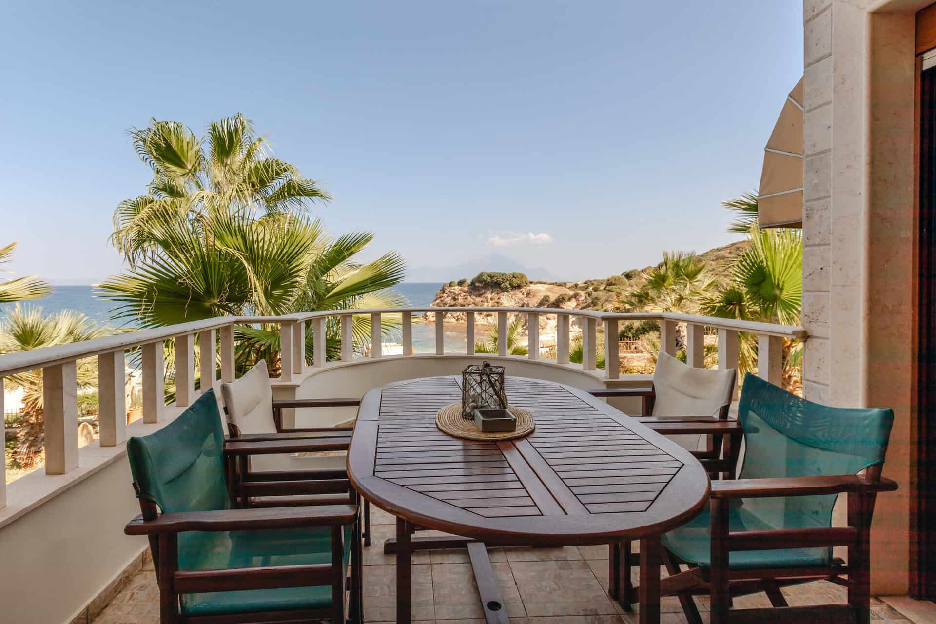 The spacious balcony becomes a focal point throughout the day, from sunrise to sunset. The views of the azure sea, Mount Athos, the beautifully kept garden and the village of Sarti create a layered scene of calm and mental unwinding.